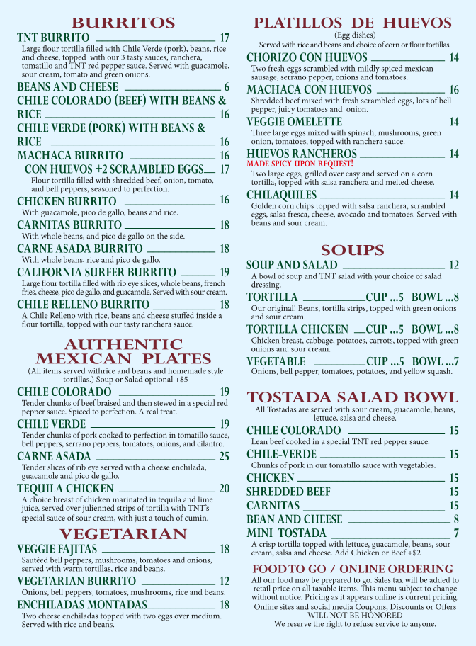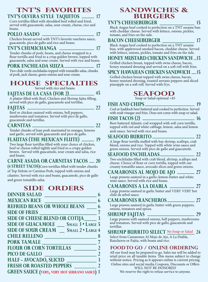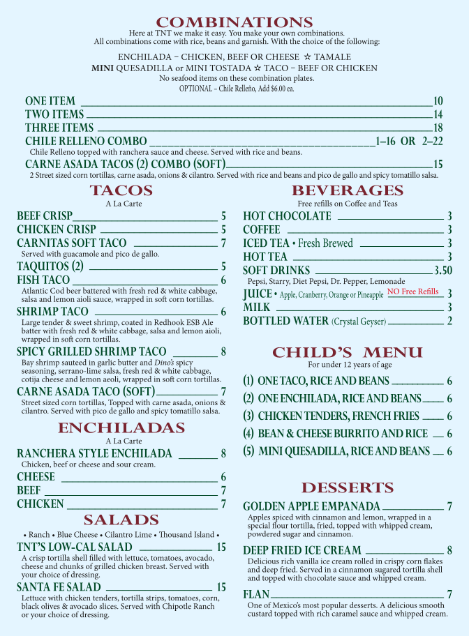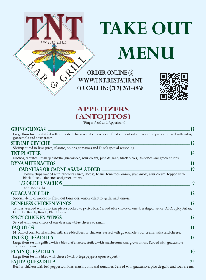 TNT on the Lake Bar & Grill Menu